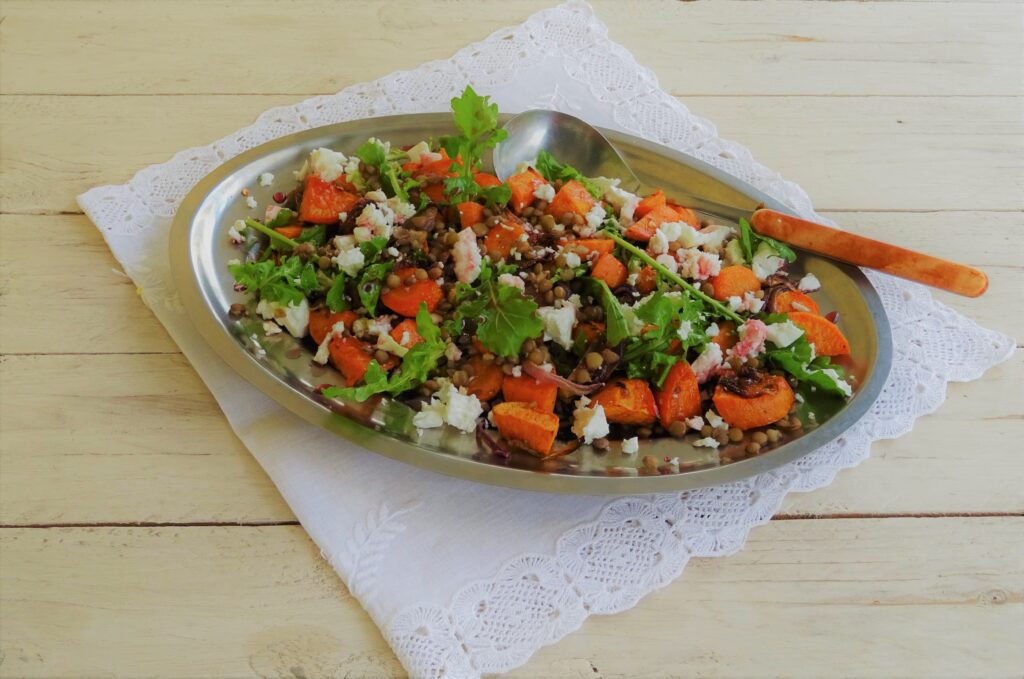 Σαλάτα με γλυκοπατάτες, καρότα, φακές και φέτα