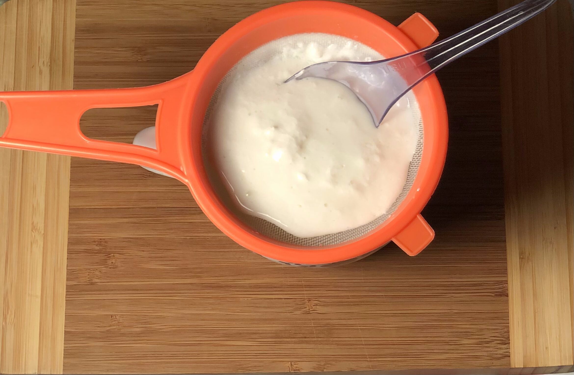 2.Μετά τη ζύμωση, οι κόκκοι στραγγίζονται από το γάλα χρησιμοποιώντας ένα σουρωτήρι, πάντα πλαστικό και με τη βοήθεια ξύλινου ή πλαστικού κουταλιού, αφήνοντας πίσω το κεφίρ.