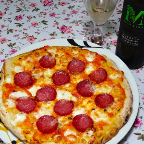 - Μεταφέρουμε με προσοχή την πίτσα πάνω στην προθερμασμένη λαμαρίνα και ψήνουμε για 8-10 λεπτά ανάλογα με το φούρνο μας,