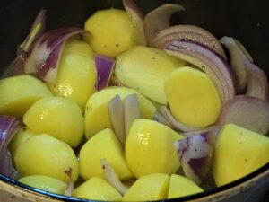 - Σε γάστρα που μπαίνει και σε εστία βάζουμε το ελαιόλαδο και μόλις ζεσταθεί προσθέτουμε τις πατάτες ( αν είναι μεγάλες τις κόβουμε στη μέση) και τα κρεμμύδια. Σοτάρουμε για δυο τρία λεπτά προσθέτουμε λίγο ζεστό νερό ή ζωμό κοτόπουλου και τοποθετούμε τη γάστρα σκεπασμένη σε προ θερμασμένο φούρνο στους 200 βαθμούς και αέρα στο κάτω ράφι του φούρνου.Ψήνουμε για 20 λεπτά.