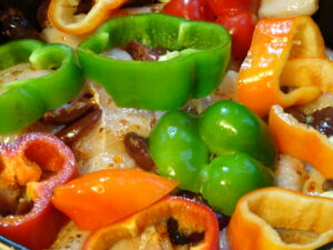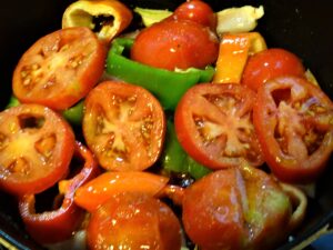 - Συνεχίζουμε με τις ελιές τις πιπεριές και τα σκόρδα.