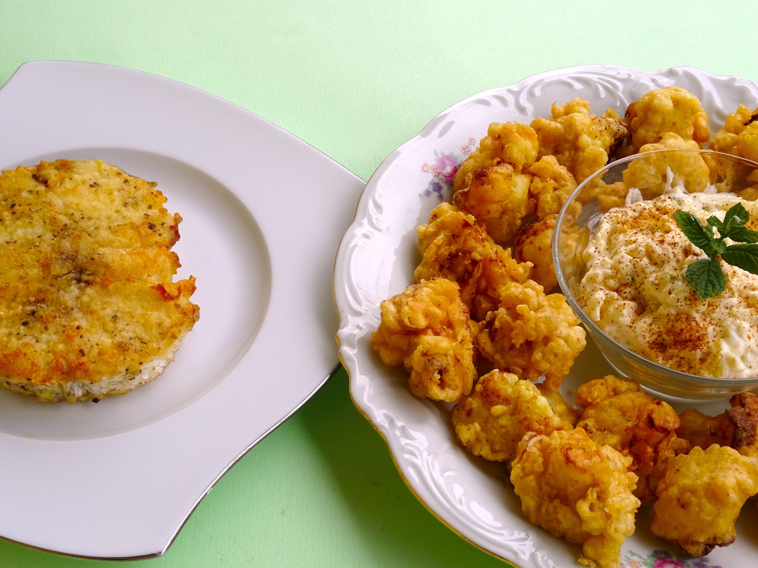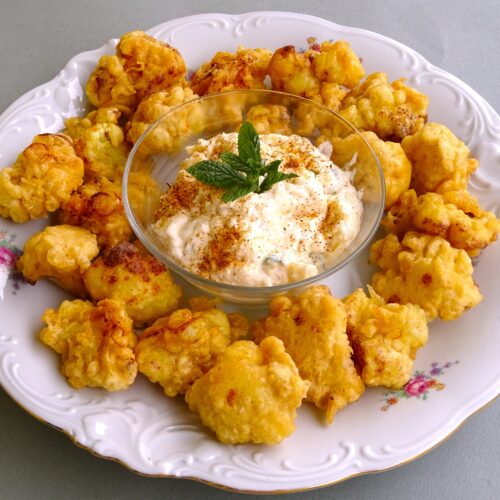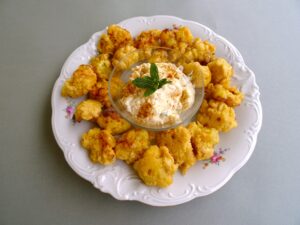 Κουνουπίδι τηγανητό σε πικάντικο κουρκούτι και ντιπ μήλου συνοδευτικό