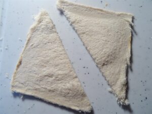 - Ξεκινάμε φτιάχνοντας μικρές "βαρκούλες" με το ψωμί.Αφαιρούμε την κόρα περιμετρικά του ψωμιού και με ένα χοντρό πλάστη το πλαταίνουμε. Κόβουμε σε τρίγωνο.