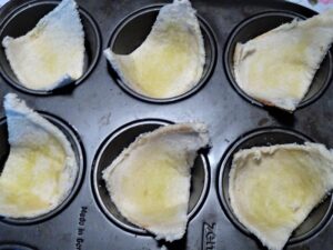 - Αλείφουμε κάθε τρίγωνο με ελαιόλαδο και το τοποθετούμε σε ταψάκι για μάφινς